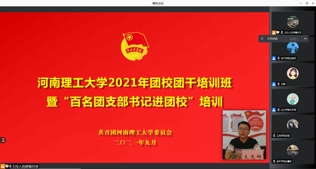 为深入贯彻落实习近平总书记“七一”重要讲话精神,全面提升我校基层团支部组织力,强化基层团支部政治功能,提高团干部思想政治素质和业务水平,更好的发挥党的助手和后备军作用,9月11日至12日,校团委通过网络平台举办了2021年团校团干培训班暨“百名团支部书记进团校”培训。校团委全体老师、各学院团委委员、年级团总支书记、班级团支部书记、校学生会与社团联合会学生骨干参加培训。校团委书记、团校校长支光辉参加开班仪式。