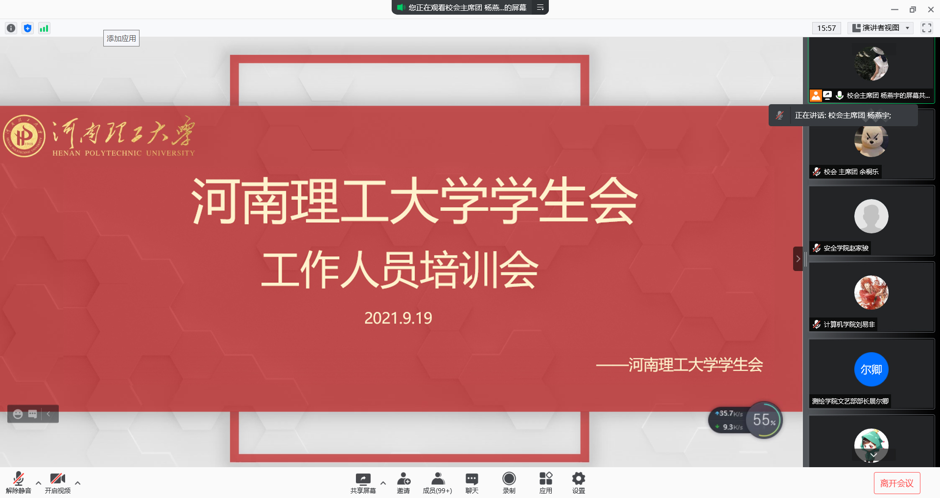 为贯彻落实从严治会要求,继续抓好学生会深化改革,帮助我校学生干部明确职能定位,9月19日下午,我校通过网络平台召开2021-2022学年第一学期学生会工作人员培训会。校、院两级学生会组织工作人员参加培训会。
