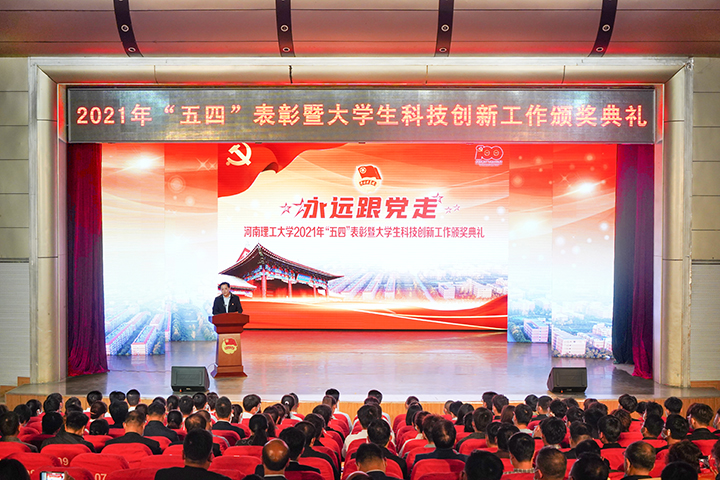 4月27日下午,学校“永远跟党走”2021年“五四”表彰暨大学生科技创新工作颁奖典礼在小礼堂隆重举行。校党委书记邹友峰、校长杨小林、校党委副书记石培哲、校党委副书记解伟、校纪委书记陈自录、副校长朱建光出席本次颁奖典礼,各职能部门负责人、各学院党委书记和副书记及团员青年代表共800余人参加典礼。