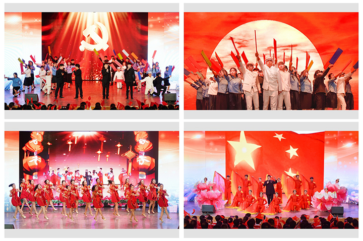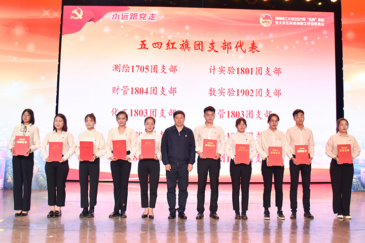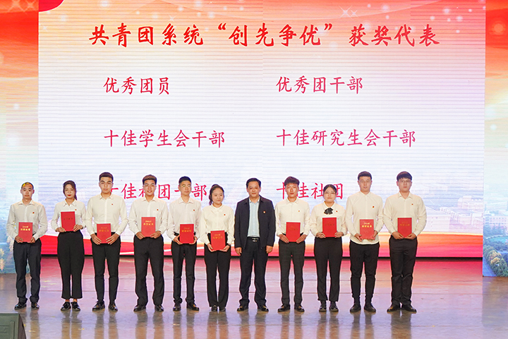 学校领导分别为获得五四红旗团委、五四红旗团支部、十佳团支部书记、优秀团员代表、大学生科技创新工作先进单位和个人代表颁奖。典礼在交响诗《没有共产党就没有新中国》中拉开序幕;舞蹈《莘莘学子心》凝聚当代青年力量,传递青年心声;情景诗歌朗诵《可爱的中国》抒发了爱党热情,激发了爱国之心;歌曲《青春》再现了革命家李大钊号召广大青年打破封建束缚、敢于创新的精神;朗诵《等待》通过“两弹元勋”邓稼先与夫人许鹿希的故事向我们展示了科技工作者的责任与坚持、使命和担当。视频节目《青春的榜样》通过历史事件勾勒出一个个鲜活的人物形象,向青年人诠释了什么是青春的榜样和努力的方向。歌舞《向往》,歌颂百年历程的中国共产党不忘初心百炼成钢,为中国人民谋幸福,为中华民族谋复兴,实现了人民对美好生活的向往。最后,全体与会人员重温入团誓词,奏唱团歌《光荣啊,中国共青团》。典礼在庄严而热烈的歌声中落下帷幕。