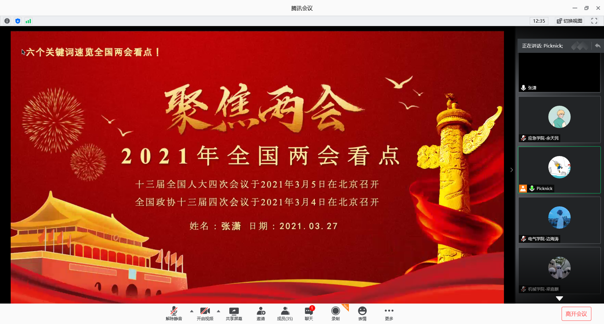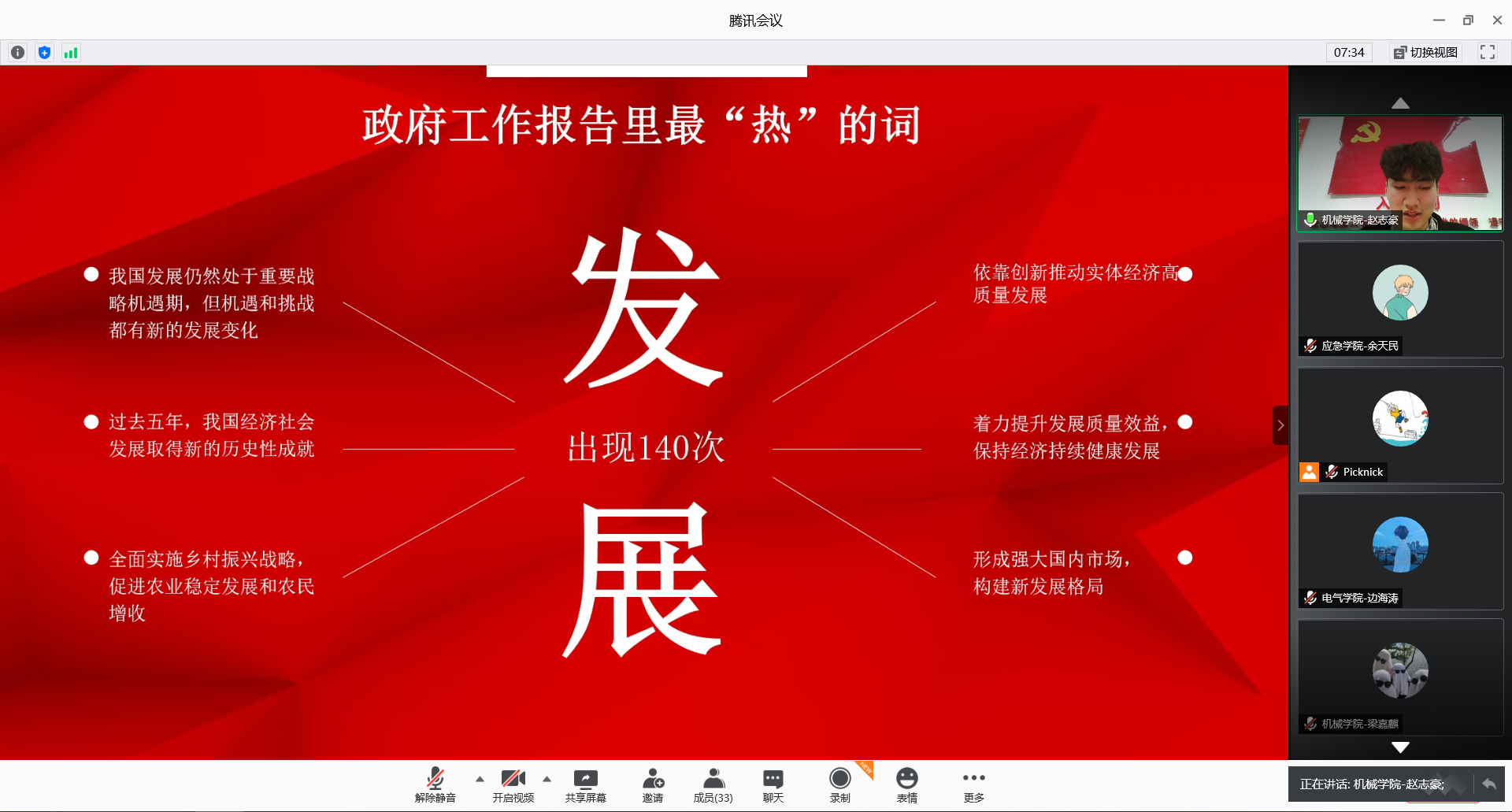 会议伊始,贾文建向全体成员介绍了本次会议的主要内容。随后,学员张潇、赵志豪、马一帆分别就两会基本情况及主要内容、政府工作报告最“热”词——发展、“十三五”时期发展成就和“十四五”时期主要目标任务三个主题,带领全体学员对“两会”精神内容进行全面深入地学习。最后,贾文建带领大家学习了习近平总书记全国两会重要讲话精神,同时鼓励大家要深刻把握精神实质和精髓要义,将两会精神融入到工作学习中,进一步提高政治站位,强化责任担当。