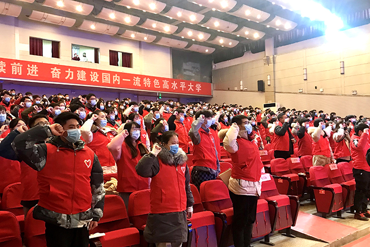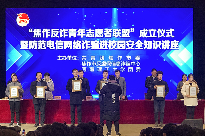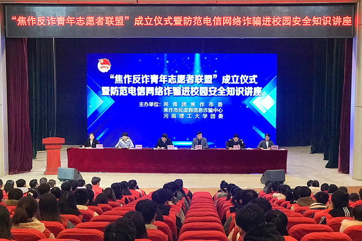 12月29日上午,在南校区小礼堂举行了“焦作反诈青年志愿者联盟”成立仪式暨防范电信网络诈骗进校园安全知识讲座活动。焦作市政法委书记胡小平、副校长赵俊伟出席仪式。焦作市公安局、共青团焦作市委、校团委等单位主要负责人和我校300余名青年志愿者参加了活动。