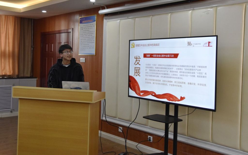 活动中,各位选手围绕演讲主题,对党的第十九届五中全会精神进行了深入解读。边海涛同学回顾了“十三五”时期的成就以及做好“十四五”规划编制的重要意义;曹晓蕊同学和张翡同学就学习党的十九届五中全会精神与大家分享了心得体会;张航嘉同学通过对“十四五”规划中9个高频词的解读,带我们明确了2035年的远景目标。本次活动主题鲜明,内容丰富,活动现场掌声不断。