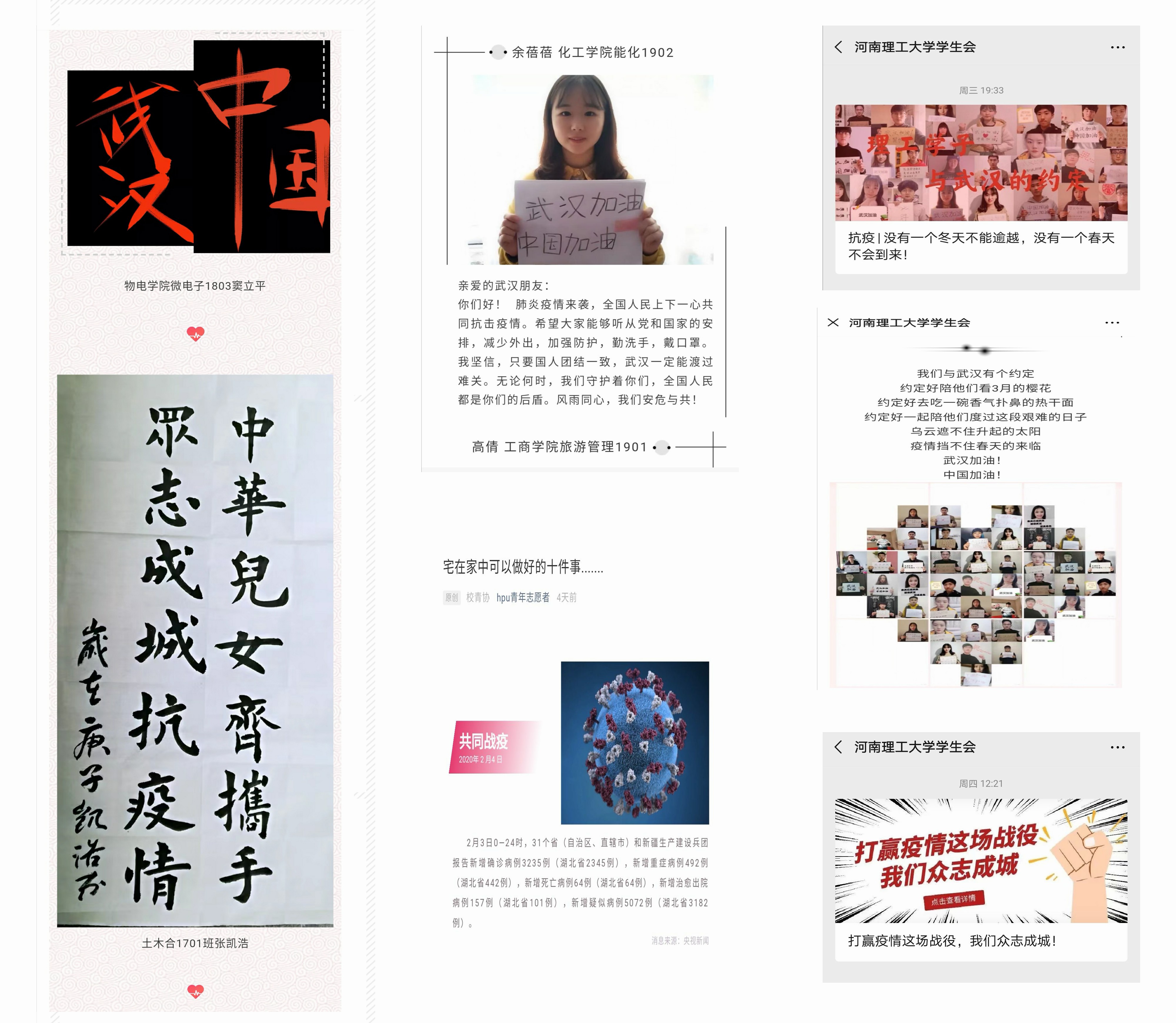 根据新型冠状病毒感染的肺炎疫情防控形势,校团委第一时间在全校各级团组织中下发了《关于组织全校各级团组织积极参与疫情防控工作的通知》,要求学校各级团组织和广大团员、团干部要切实把思想和行动统一到习近平总书记重要指示精神和党中央决策部署上来,坚决听党指挥,切实发挥模范带头作用,在学校党委统一指挥下,科学、有序参与疫情防控工作。同时,以团支部为单位,以网络为载体,开展疫情防控专项学习,引导团员青年进一步增强“四个意识”、坚定“四个自信”、做到“两个维护”。1月24日,校学生会官方微信推文《新型病毒来袭,防控疫情我们一直在一起》,宣传普及防护知识,倡导广大理工学子坚定信心、科学防范、做好表率。随后,校学生会、校青年志愿者协会通过微信公众号、微博等线上途径,积极宣传《教育部致全国大学生的一封信》《河南理工大学关于做好新型冠状病毒感染的肺炎疫情防控工作的紧急通知》等,将上级和学校党委关于疫情防控工作的有关精神及时传递给每一位理工青年学子。同时,推送《致全校同学关于防范新型冠状病毒肺炎的倡议书》《钟南山再战防疫最前线》《危难当前,方显民族力量》《打赢疫情这场战役,我们众志成城!》等40余篇,进一步坚定了广大理工青年抗击疫情的信心、掀起了行动起来的热潮。各学院青年学子还在朋友圈、QQ空间进行“防控疫情、从我做起”为题的接力活动,传递温情正能量,为武汉加油、为中国鼓劲。
