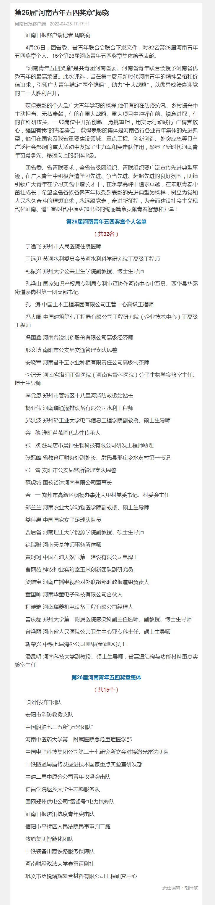 近日,第26届“河南青年五四奖章”名单揭晓,来自不同行业不同领域的32人获此殊荣,我校能源学院教师贾后省喜获表彰。