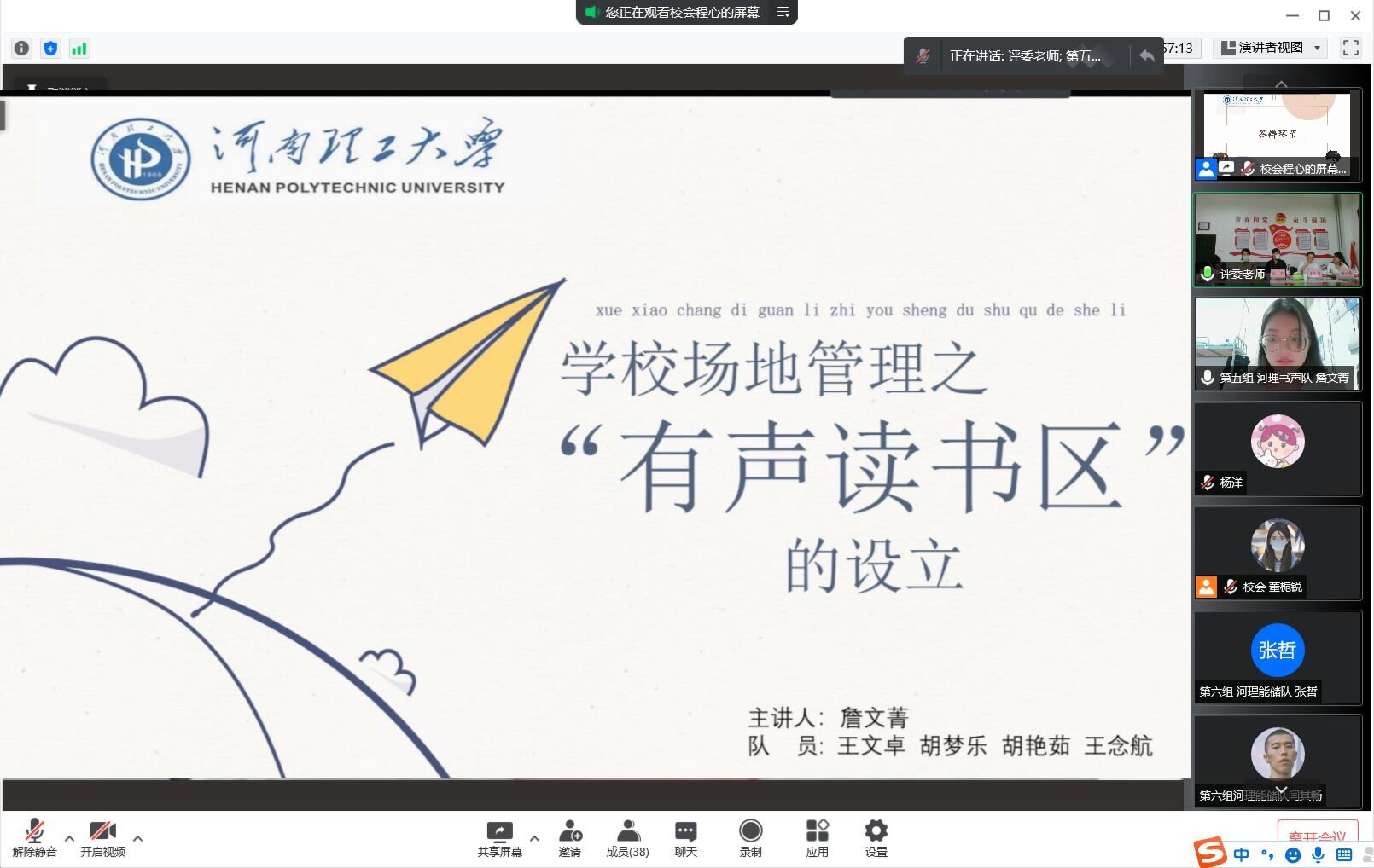 4月23日下午,河南理工大学首届学生校园提案大赛决赛通过腾讯会议举行。校团委、教务处、研工部、学院相关负责人担任决赛评委。