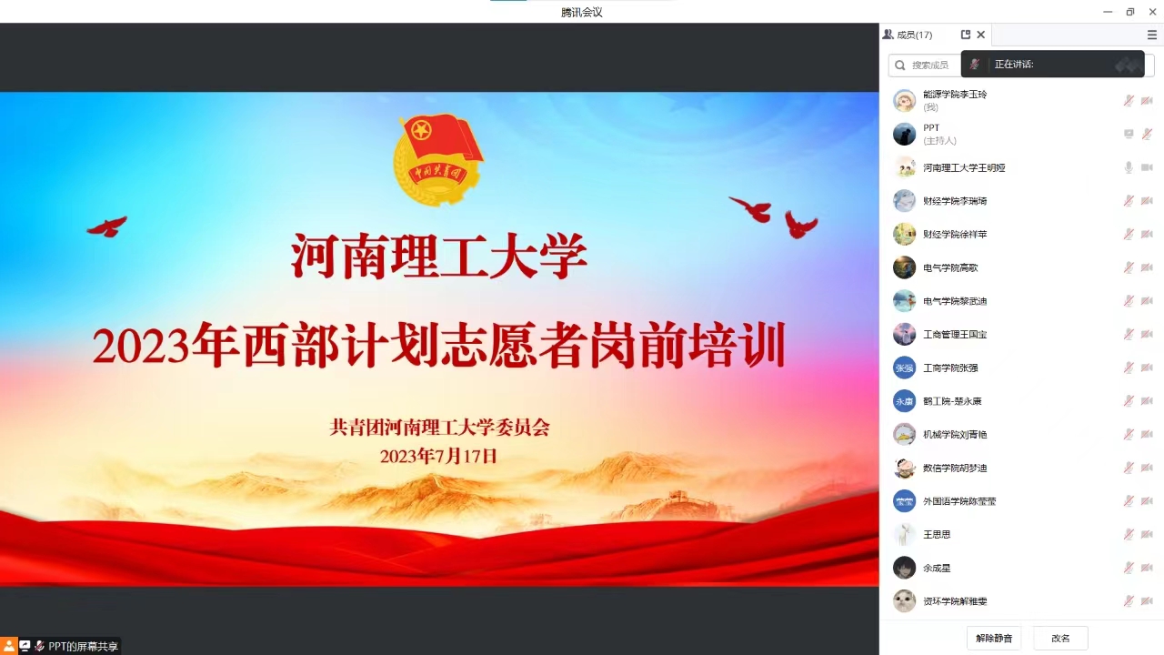 为引导我校西部计划志愿者主动融入国家发展大局,积极投身乡村振兴,大力弘扬奉献、友爱、互助、进步的志愿精神,培育和践行社会主义核心价值观,7月17日,我校通过腾讯视频会议举办2023年西部计划志愿者岗前培训。2023年全体西部计划志愿者(含25届研究生支教团)参加培训。
