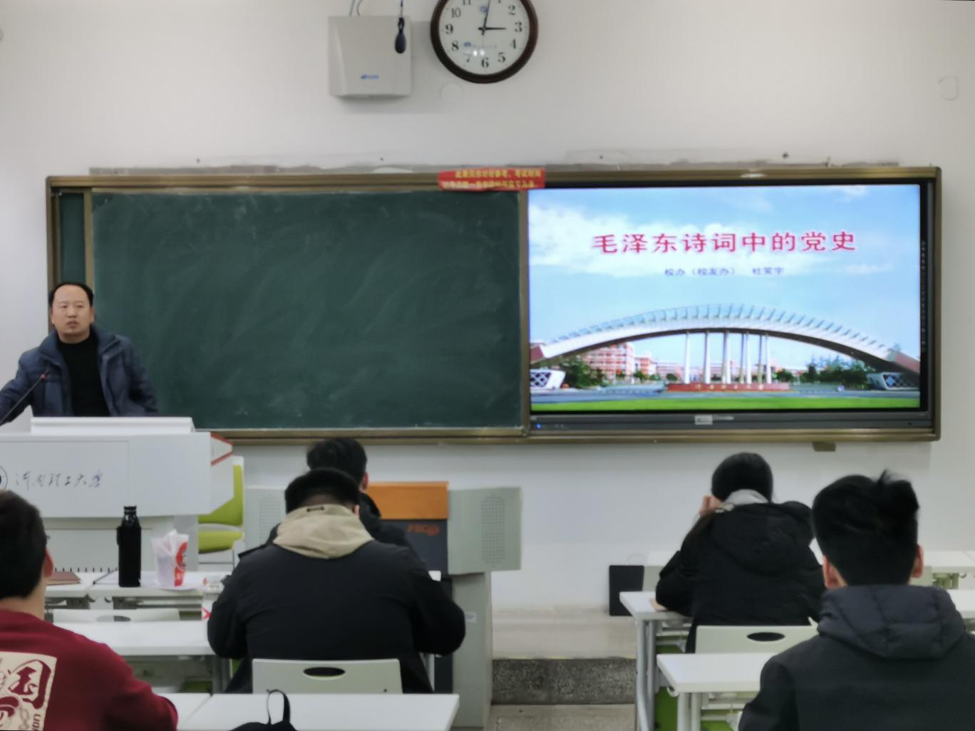 11月28日下午,校团委邀请校宣讲团专家杜笑宇为第十三期“青马工程”培养班学员作题为《毛泽东诗词中的党史》的专题讲座。此次讲座在南校区一号教学楼1111室举行,青马班学员参加讲座。