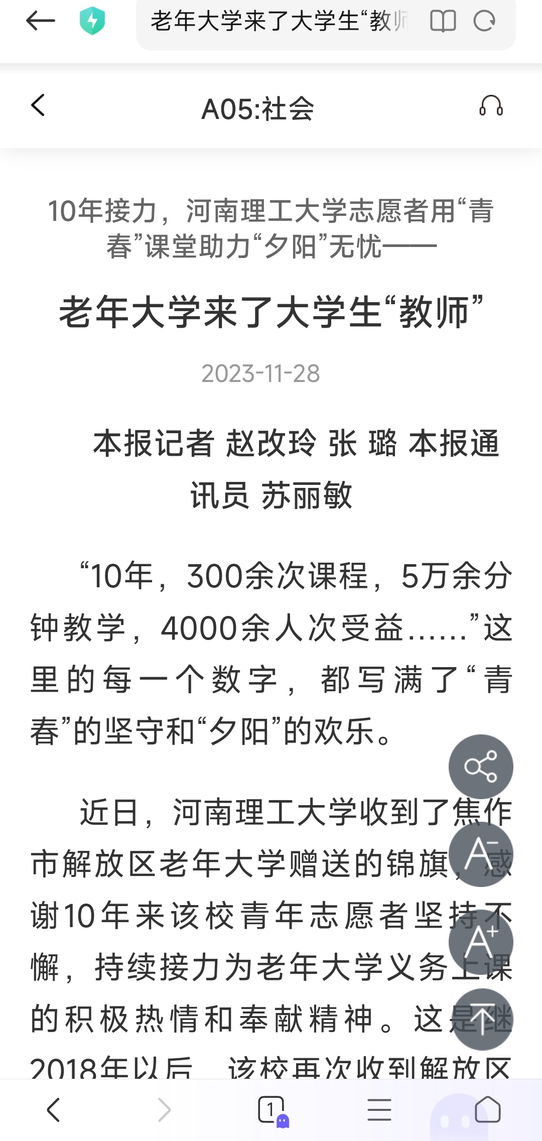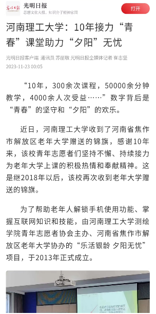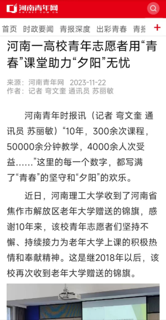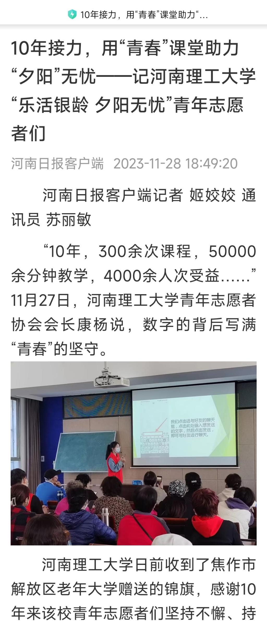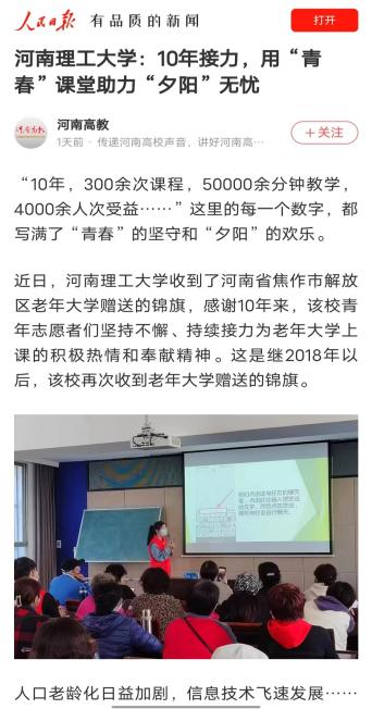 近日,河南理工大学收到了河南省焦作市解放区老年大学赠送的锦旗,感谢10年来,该校青年志愿者们坚持不懈、持续接力为老年大学上课的积极热情和奉献精神。连日来,光明日报客户端、河南日报客户端、人民日报客户端等媒体也对此作了报道,相关内容如下: