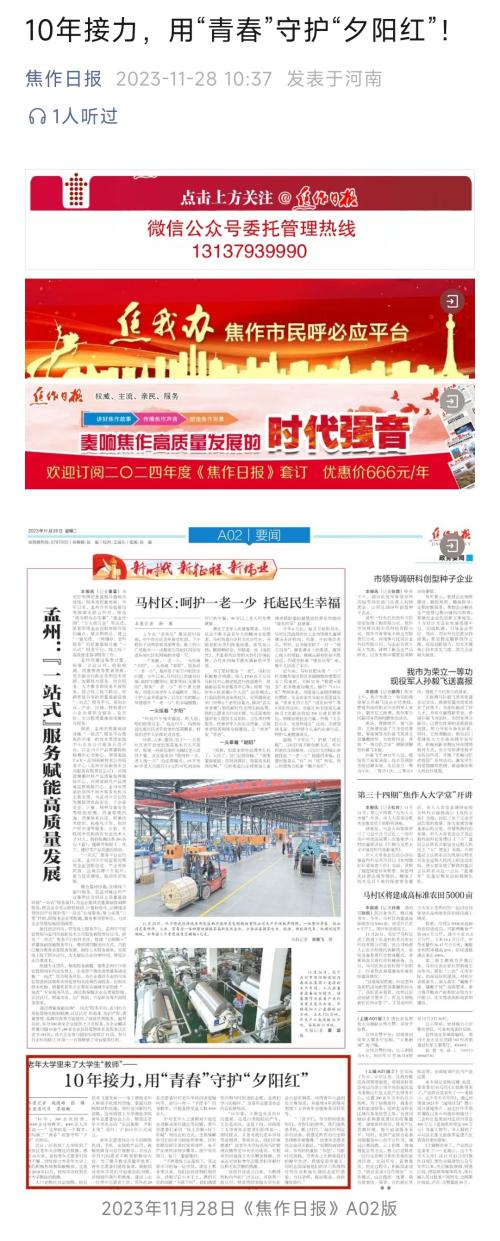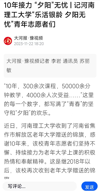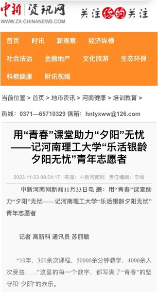 近年来,河南理工大学团委坚持以习近平新时代中国特色社会主义思想为指导,深入学习宣传贯彻党的二十大精神,深入贯彻落实习近平总书记关于志愿服务的重要指示批示精神,以志愿服务体制机制为抓手,以志愿服务项目品牌为导向,以志愿服务工作成效为核心,不断加强志愿服务统筹协调,组织引导我校各级志愿服务组织参与国家战略、服务民生大计、融入社会治理、展示中国形象,在实际行动中涵养主流价值、培育文明新风。此次光明日报客户端、河南日报客户端、人民日报客户端等媒体报道的志愿服务工作,既是对学校青年弘扬“老吾老以及人之老”的中华传统美德的充分肯定,也是学校志愿者践行“青年有信仰、国家有力量、民族有希望”的生动体现,更是对学校志愿服务工作的激励。下一步,河南理工大学团委将以更主动的作为、更有效的举措,继续弘扬志愿精神,团结引导广大志愿者,扎实推进志愿服务高质量发展,为建设现代化国家贡献更大力量!