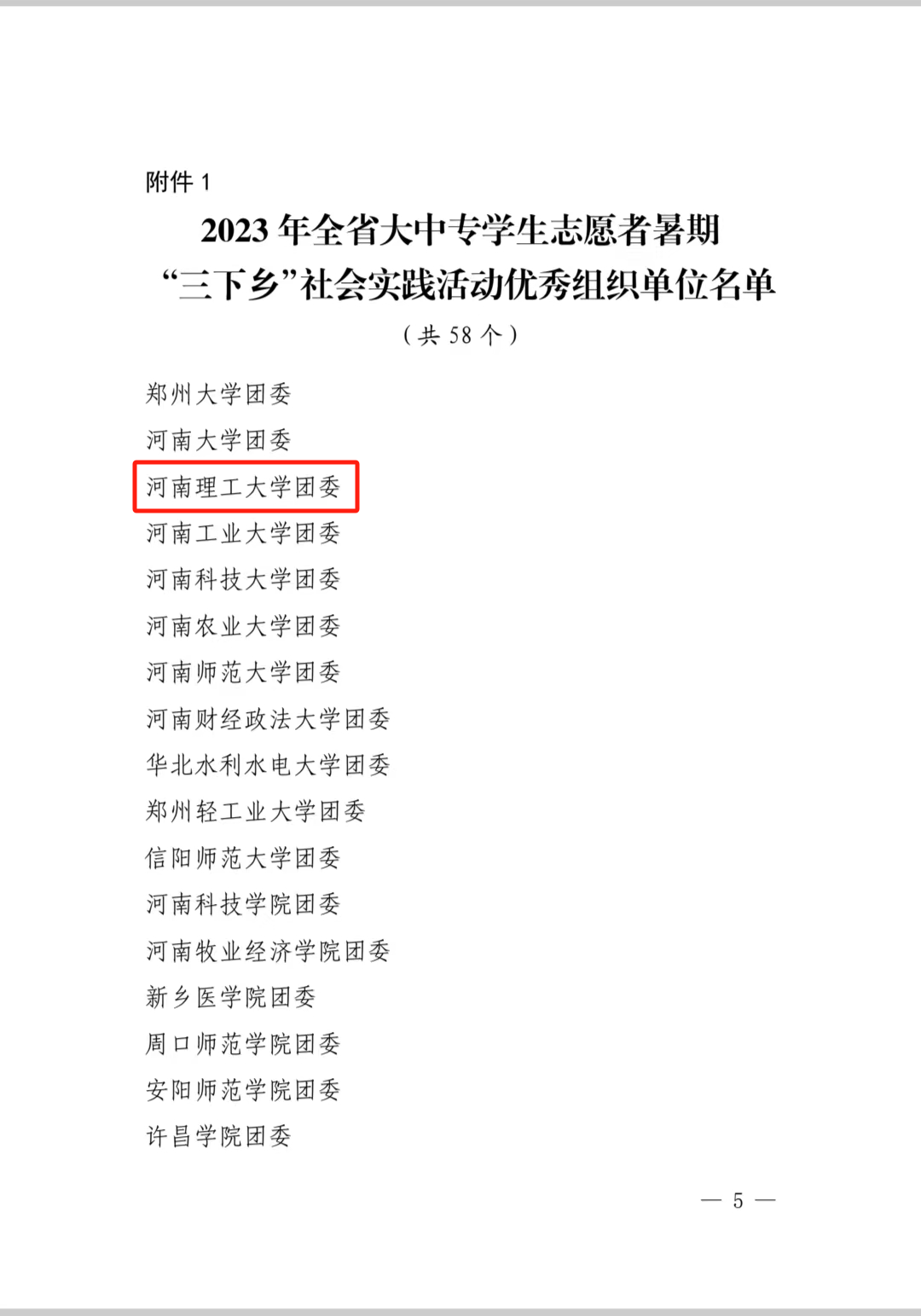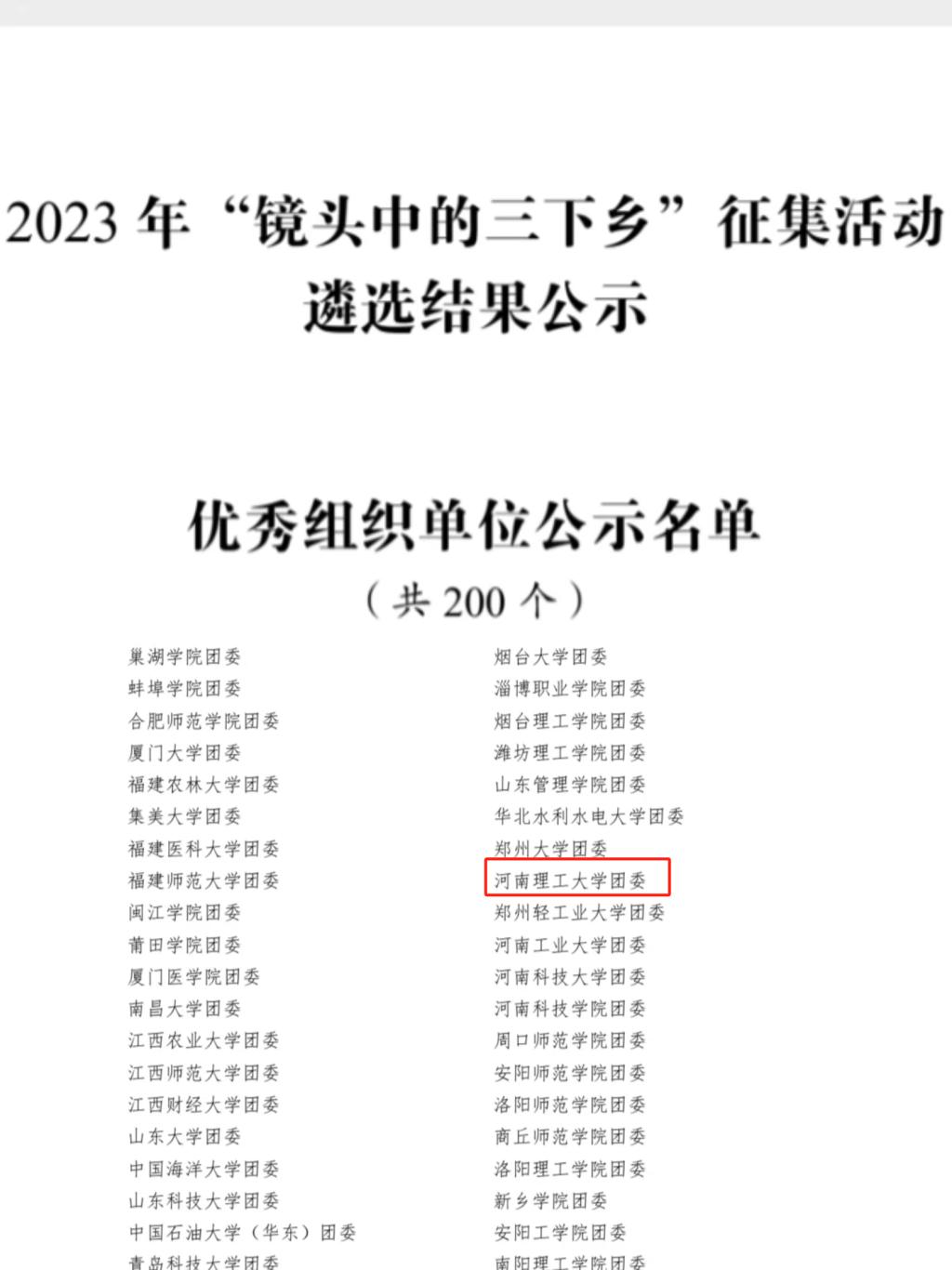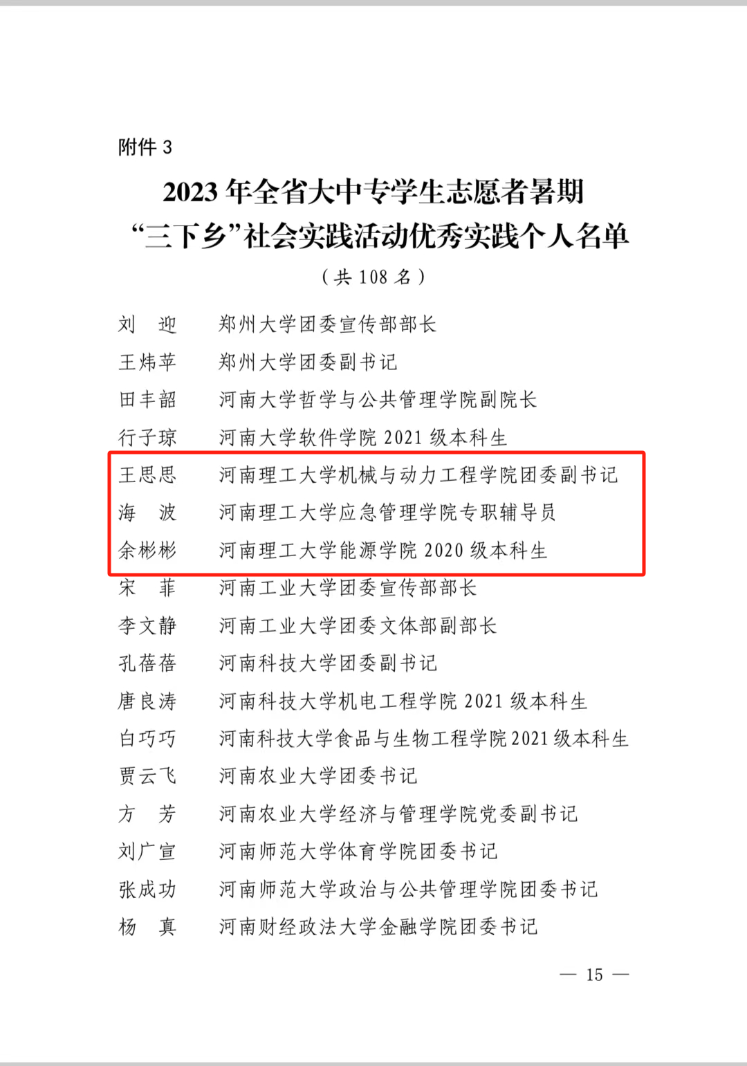 此外,在河南省暑期“三下乡”社会实践活动省级优秀工作典型的通报中,校团委被授予“2023年全省暑期社会实践活动优秀单位”荣誉称号;数信学院“扬数学之妙,启少年之行”实践团、电气学院“传承红色精神,繁荣优秀文化,实践致敬二十大”实践团和外国语学院“遇石文化”社会实践团荣获“2023 年全省大中专学生志愿者暑期‘三下乡’ 社会实践活动优秀实践团队”荣誉称号;建艺学院“太行山上,青天河畔”实践团和工商学院“寻迹-传承延安精神续初心”实践团荣获2023 年全省大中专学生志愿者暑期“三下乡”社会实践活动优秀品牌项目;机械学院王思思、应急学院海波和能源学院余彬彬同学荣获“2023 年全省大中专学生志愿者暑期‘三下乡’ 社会实践活动优秀个人”荣誉称号。