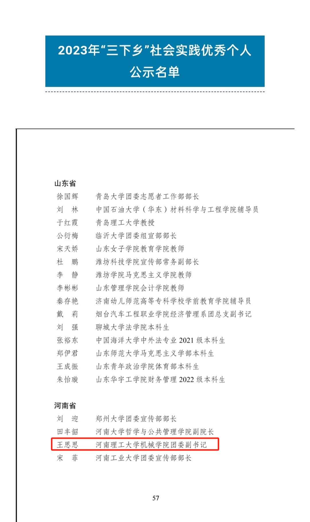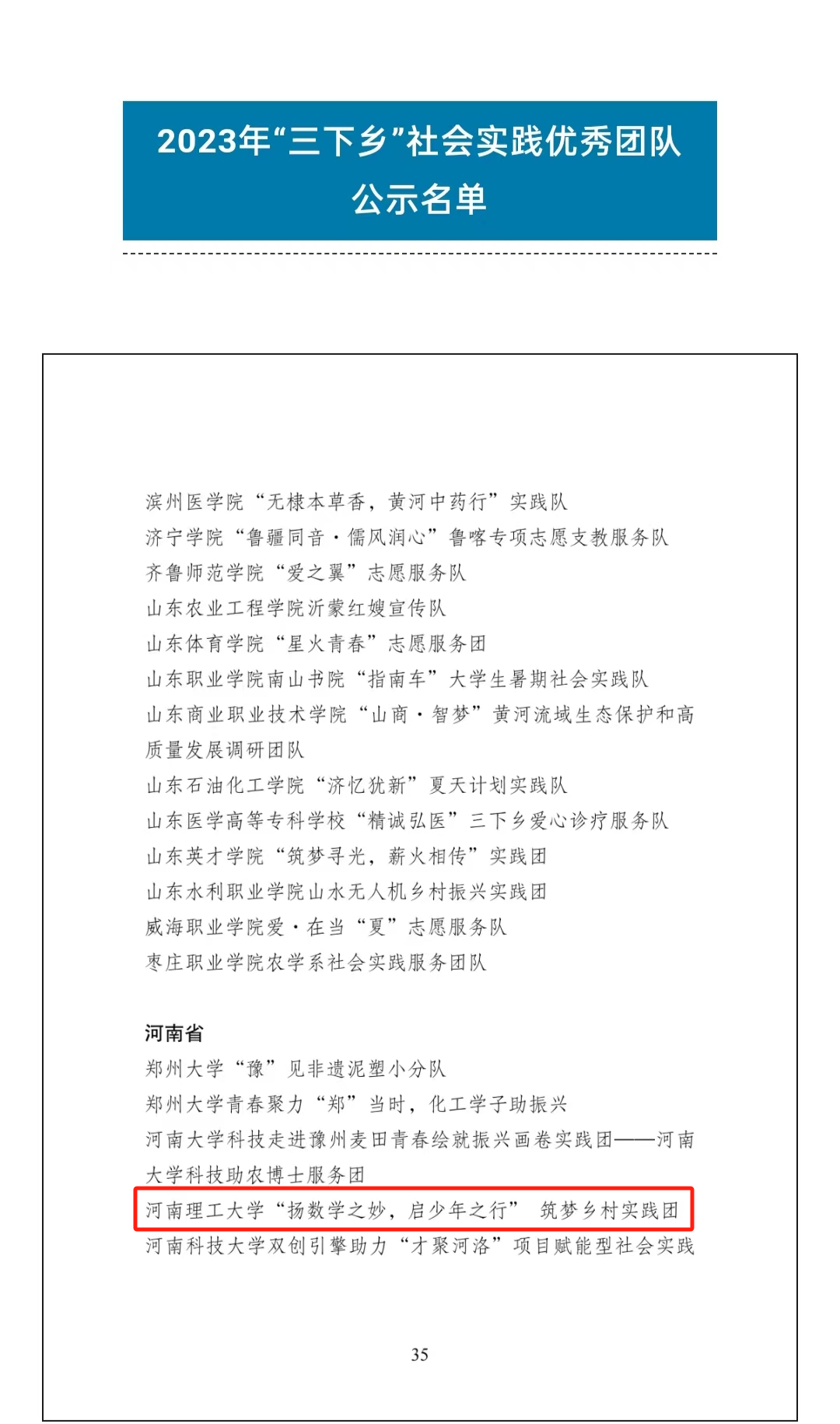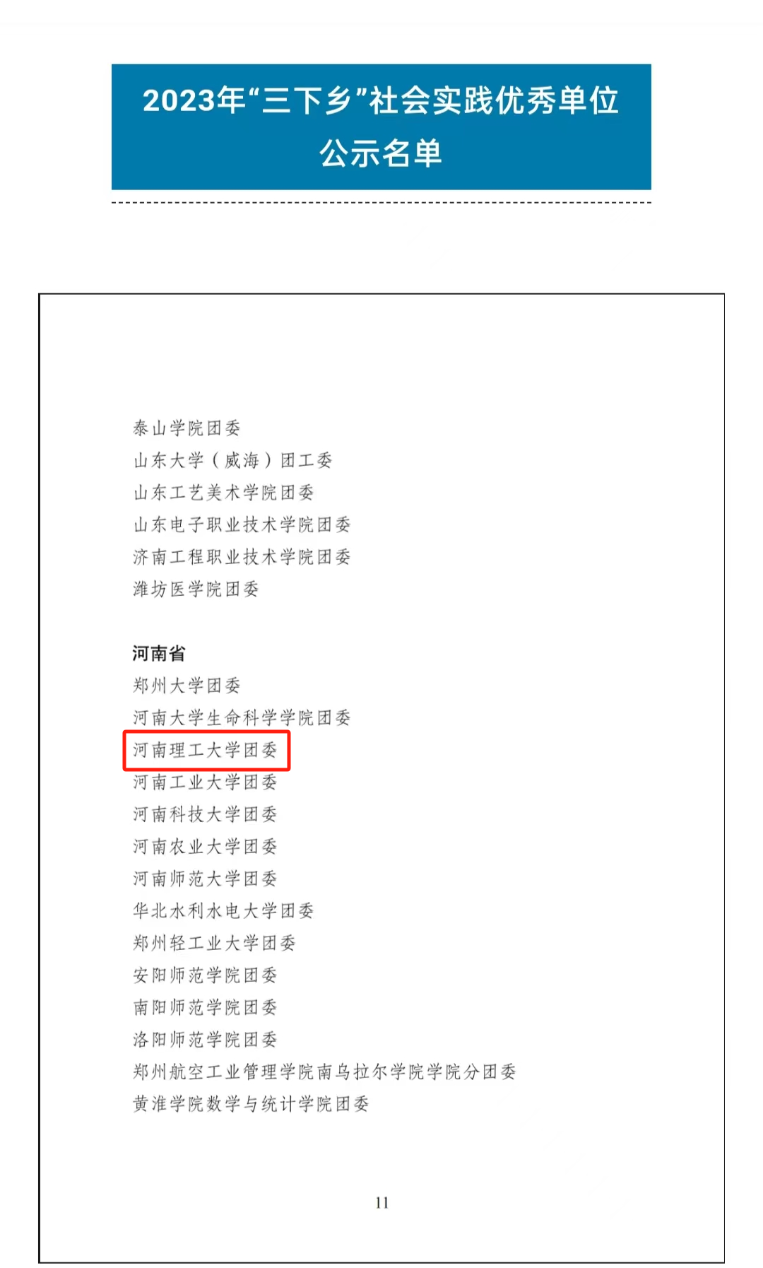 此外,在河南省暑期“三下乡”社会实践活动省级优秀工作典型的通报中,校团委被授予“2023年全省暑期社会实践活动优秀单位”荣誉称号;数信学院“扬数学之妙,启少年之行”实践团、电气学院“传承红色精神,繁荣优秀文化,实践致敬二十大”实践团和外国语学院“遇石文化”社会实践团荣获“2023 年全省大中专学生志愿者暑期‘三下乡’ 社会实践活动优秀实践团队”荣誉称号;建艺学院“太行山上,青天河畔”实践团和工商学院“寻迹-传承延安精神续初心”实践团荣获2023 年全省大中专学生志愿者暑期“三下乡”社会实践活动优秀品牌项目;机械学院王思思、应急学院海波和能源学院余彬彬同学荣获“2023 年全省大中专学生志愿者暑期‘三下乡’ 社会实践活动优秀个人”荣誉称号。