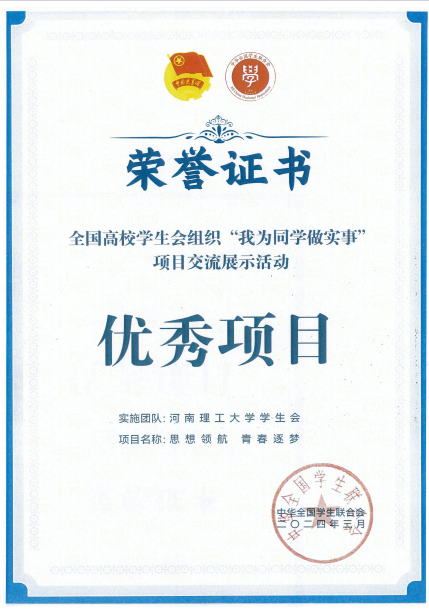 为深入贯彻落实习近平总书记关于青年工作的重要思想,深化高校学生会组织改革,推动学生会组织切实践行“全心全意为同学服务”的宗旨,3月21日至3月24日,由共青团中央指导、中华全国学生联合会主办,共青团贵州省委、贵州省学生联合会、贵州师范大学承办的全国高校学生会组织“我为同学做实事”项目交流展示活动在贵州师范大学成功举办。经学校自荐、省级推报、全国遴选、现场答辩等环节,我校学生会“思想领航 青春逐梦”项目荣获全国高校学生会组织“我为同学做实事”优秀项目荣誉称号。