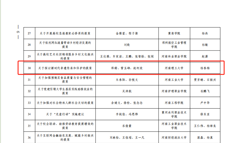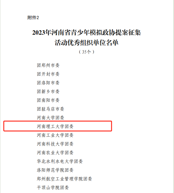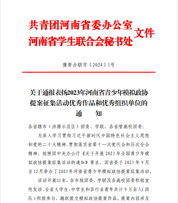 为深入学习宣传贯彻党的二十大精神,全面落实团十九大各项部署,鼓励学生了解并有序参与中国特色社会主义民主政治实践,校团委精心组织开展了2023年河南省青少年模拟政协提案征集活动,动员全校广大青年学生积极参与,共收到提案作品430件。校团委按照“选题准确、分析深入、操作性强”的标准,对收到的提案作品进行初步审核和筛选,并组织相关职能部门对筛选出的12件提案作品进行评审,最终评出2份优秀提案作品,推荐至团省委。
