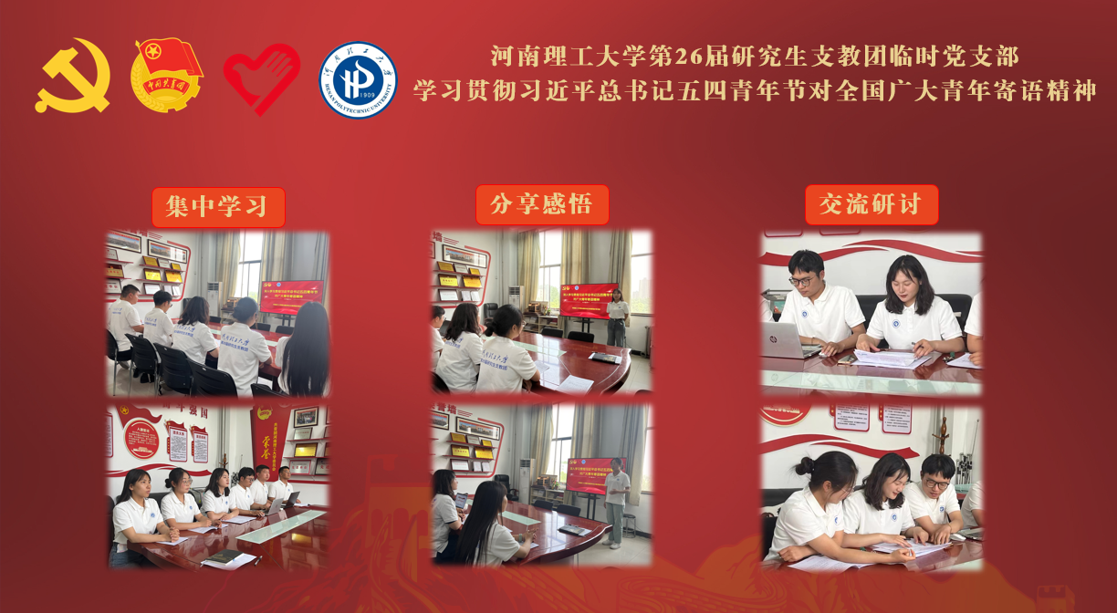 活动中,河南理工大学第26届研究生支教团临时党支部通过研读资料和观看视频回顾学习了五四精神和习近平总书记五四青年节对全国广大青年寄语,进一步学习和理解了五四精神的深刻内涵和习近平总书记对当代青年的殷切希望,更深刻了地感受到了作为新时代大学生和研究生支教团成员的重要使命。在交流讨论和分享环节,研支团同学就如何学习贯彻习近平总书记五四青年节对全国广大青年寄语精神和自己的启发进行了热议。通过学习分享和热议讨论,我校第26届研究生支教团同学表示要坚定不移听党话、跟党走,争做有理想、敢担当、能吃苦、肯奋斗的新时代青年,用实际行动展现青春作为、彰显青春风采,立志在西部支教中绽放青春之花,为实现中华民族伟大复兴的中国梦贡献力量。