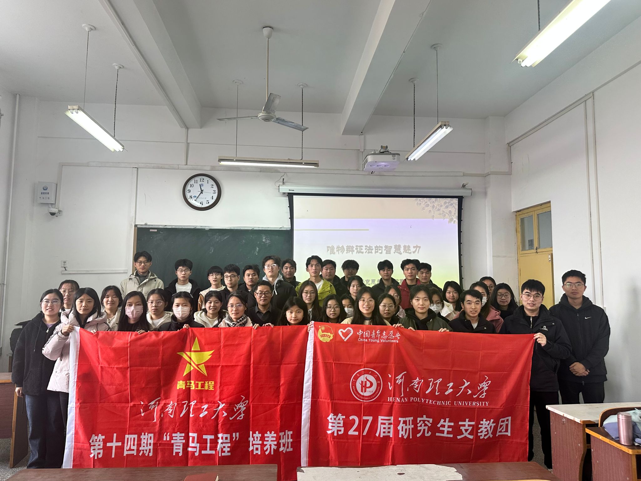 (图/郭梦晴 文/孙云静)为提升青年学生的政治素养和理论水平,加深同学们对马克思主义原理的理解,11月30日,我校第十四期“青马工程”培养班第三次专题讲座在南校区材料学院1306教室举行。马克思主义学院葛宇宁副教授受邀为第十四期“青马工程”培养班学员作题为《唯物辩证法及方法论启示》的专题讲座,第十四期青马班学员与第27届研究生支教团成员参加。