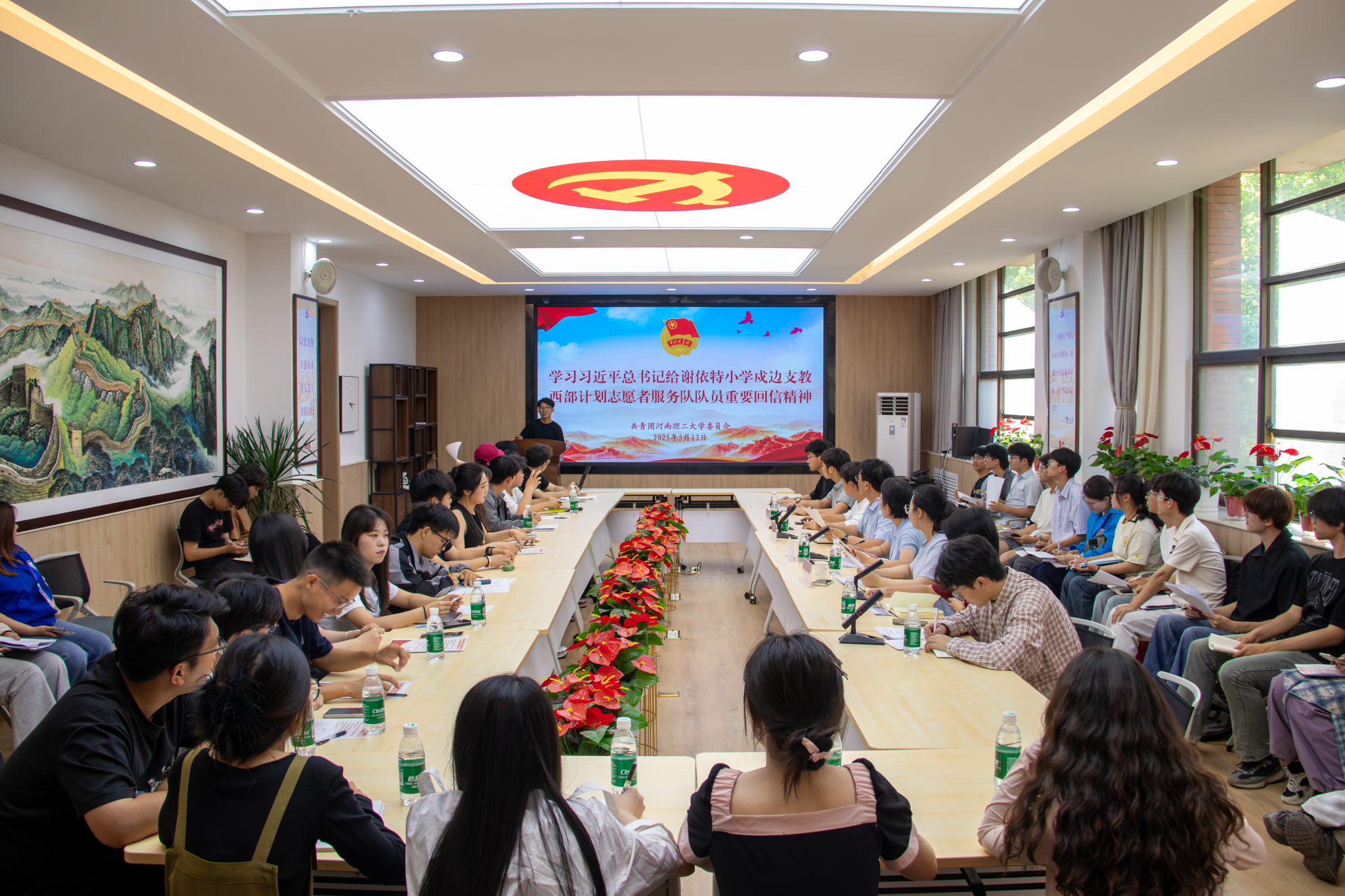 5月13日,校院两级学生会组织在测绘学院221会议室召开会议,学习贯彻习近平总书记重要讲话《激励新时代青年在中国式现代化建设中挺膺担当》和给谢依特小学戍边支教西部计划志愿者服务队队员回信精神。校团委、测绘学院相关负责人和校院两级学生会主席团成员参加。
