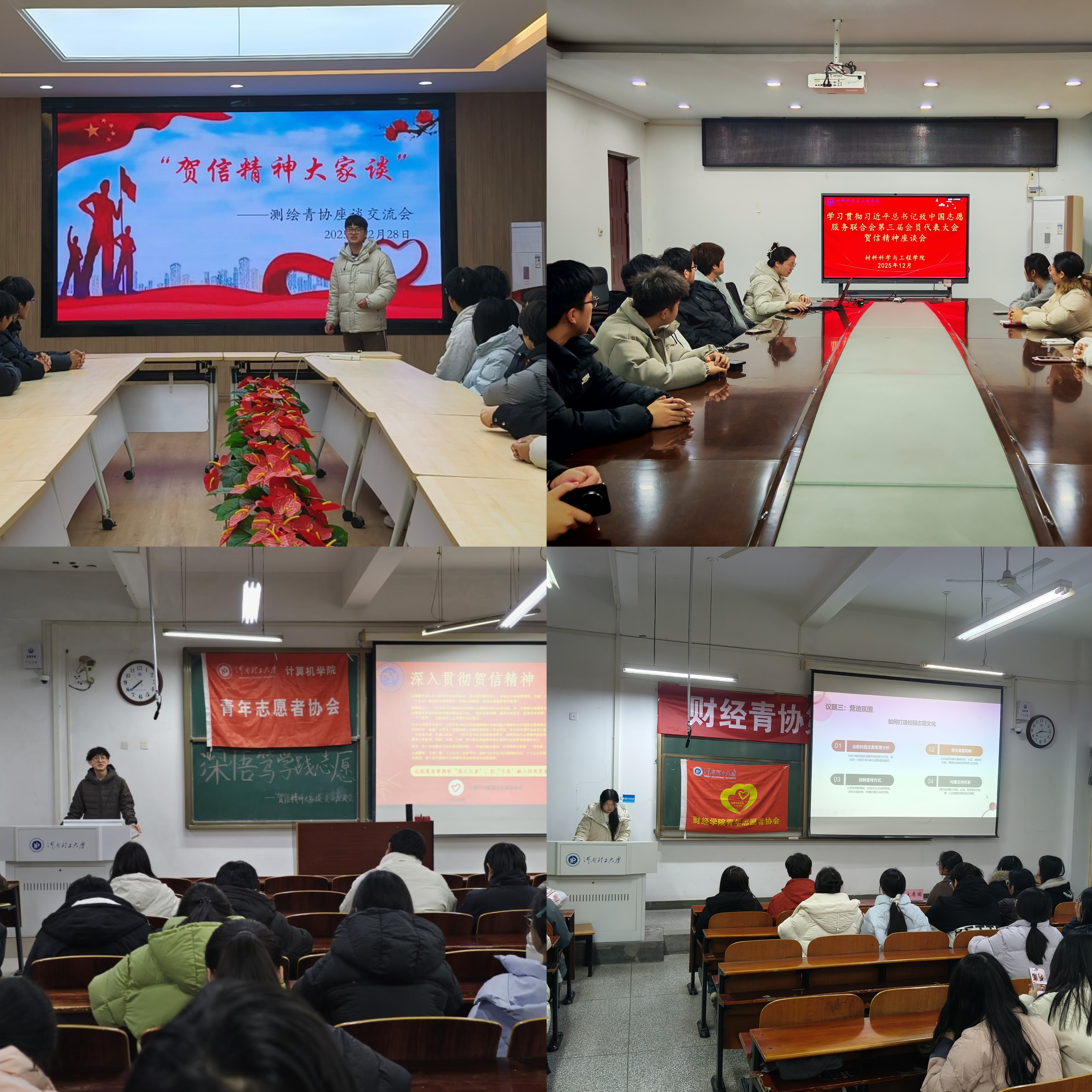 校青协和研支团开展“结合贺信精神,提质志愿服务工作”专题研讨会,围绕志愿服务体系建设、资源整合共享等关键问题深入研讨,明确以贺信精神为根本遵循,进一步优化学校志愿服务管理制度,加强志愿者专业能力培训,推动志愿服务与校园建设、社会需求深度融合,让志愿服务成为学校育人工作的重要载体;各学院青协聚焦“贺信精神大家谈”核心主题,组织开展多场座谈交流活动。青年志愿者们围绕贺信中“传递真善美,传播正能量”的殷切嘱托,结合专业特色与志愿服务实践经验各抒己见,深入探讨志愿服务在服务国家战略、服务百姓民生、服务社会治理中的重要价值,相关活动实况通过学院官方新媒体平台及时发布,扩大了学习宣传的覆盖面与影响力;基层团支部作为学习实践的重要阵地,以“学习贺信精神,争做志愿先锋”为主题广泛开展团课活动。各团支部通过专题学习、案例分享、情景模拟等丰富形式,带领团员青年深入领会贺信精神的核心要义与实践要求,详细解读志愿服务在社会文明进步中的重要意义,主题团课已实现全院系覆盖,有效激发了青年学子参与志愿服务的内生动力。