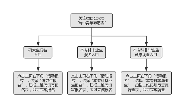 符合返校条件、自愿参加学校疫情防控工作的学生前往校青协微信公众号“hpu青年志愿者”填写《河南理工大学2020年春季学期学生开学返校校园疫情防控志愿者报名登记表》(附件1)进行预报名,研究生预报名时间为5月8日至5月11日,本、专科毕业年级学生预报名时间为5月8日至5月14日,其他年级本、专科学生填写《河南理工大学2020年春季学期学生开学返校校园疫情防控志愿服务意向调查表》(附件2)进行志愿服务意向网上调查,调查时间为5月8日至5月22日。具体报名流程详见《河南理工大学2020年春季学期学生开学返校校园疫情防控志愿者报名流程》(附件3)。