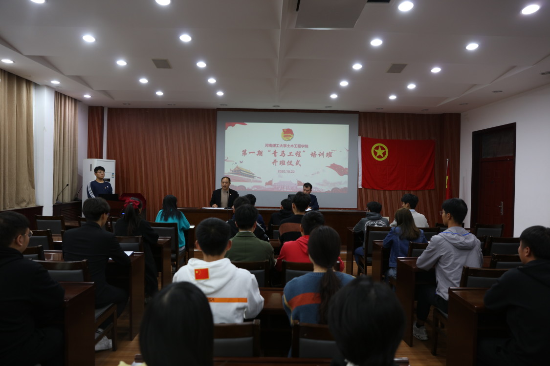 开班仪式在全体人员齐唱《共青团团歌》中拉开帷幕。会议中,尹铁军指出,“青马工程”培训班的开办目的及意义是通过开展思想政治理论课,培养我院优秀学生成为中国特色社会主义伟大事业的合格建设者和可靠接班人。他强调,“青马班”全体学员要牢固树立科学的世界观、价值观和人生观,打牢马克思主义基本理论功底,用正确的理论、观点、方法分析和解决问题。接着学生代表韩雨麟进行发言,作为土木学院第一届“青马工程”学员,我们全体学员将严格遵循“青马班”的规章制度,认真学习马克思主义理论,将理论运用于实际,发挥自己的知识与专业技术优势,服务同学、服务学校、服务社会,同时将会积极参加各项社会公益活动,增强自身的时代责任感与使命感。
