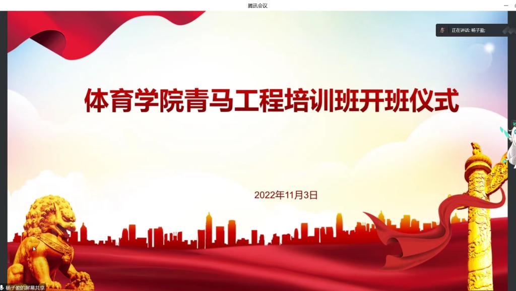 为更好的贯彻落实党员发展的系列工作,依据学校党委和学院党委的统一要求与安排部署,11月3日下午3:00,体育学院在线上举行了2022年入党积极分子暨青马工程培训班开班仪式。出席本次开班仪式的领导有体育学院党委副书记马志洋、辅导员黄会娟老师、孙玉景老师以及体育学院2022年各班的几位骨干。