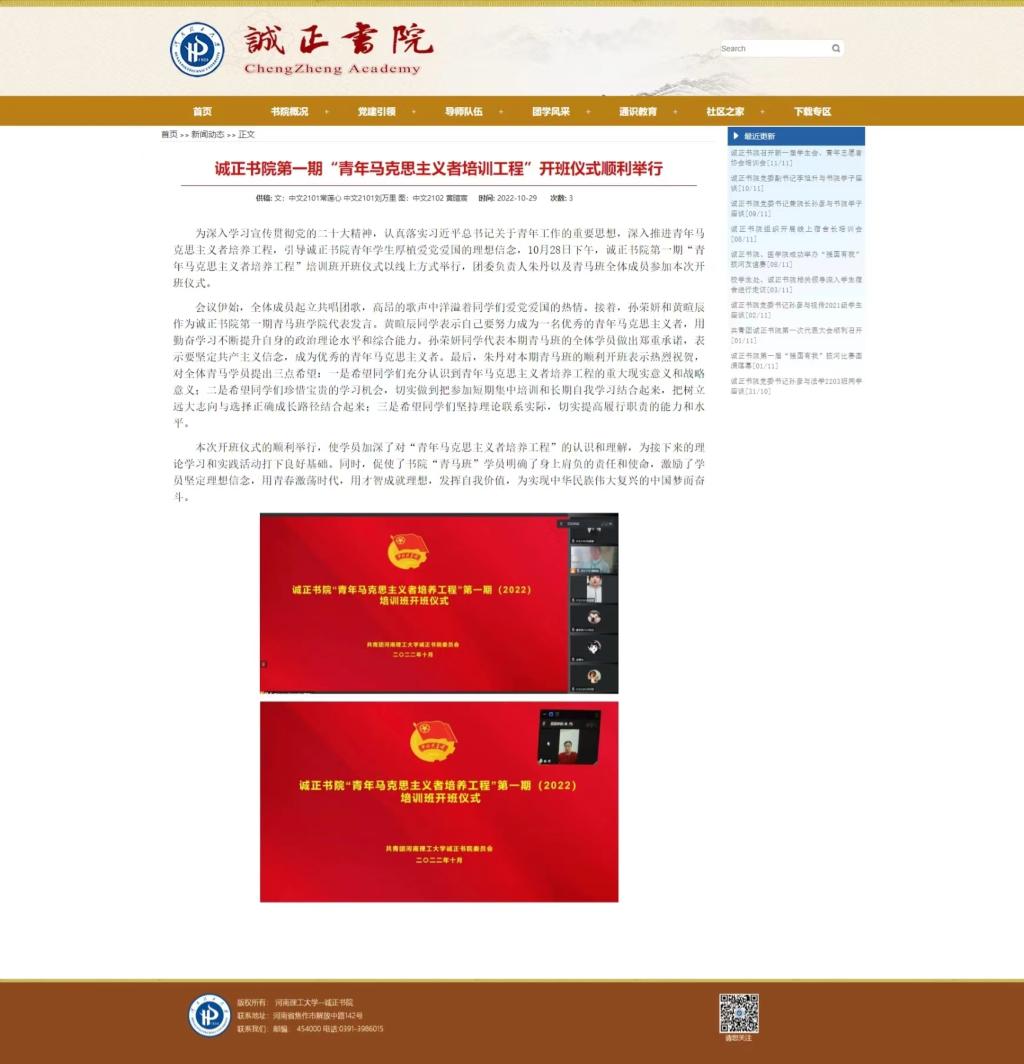 为深入学习宣传贯彻党的二十大精神,认真落实习近平总书记关于青年工作的重要思想,深入推进青年马克思主义者培养工程,引导诚正书院青年学生厚植爱党爱国的理想信念,10月28日下午,诚正书院第一期“青年马克思主义者培养工程”培训班开班仪式以线上方式举行,团委负责人朱丹以及青马班全体成员参加本次开班仪式。