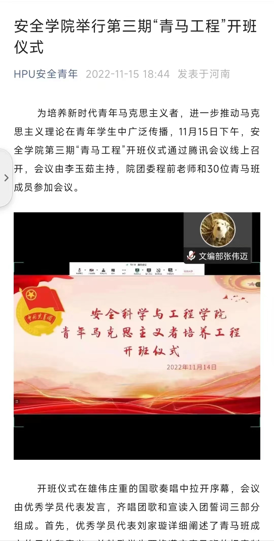 为培养新时代青年马克思主义者,进一步推动马克思主义理论在青年学生中广泛传播,11月15日下午,安全学院第三期“青马工程”开班仪式通过腾讯会议线上召开,会议由李玉茹主持,院团委程前老师和30位青马班成员参加会议。