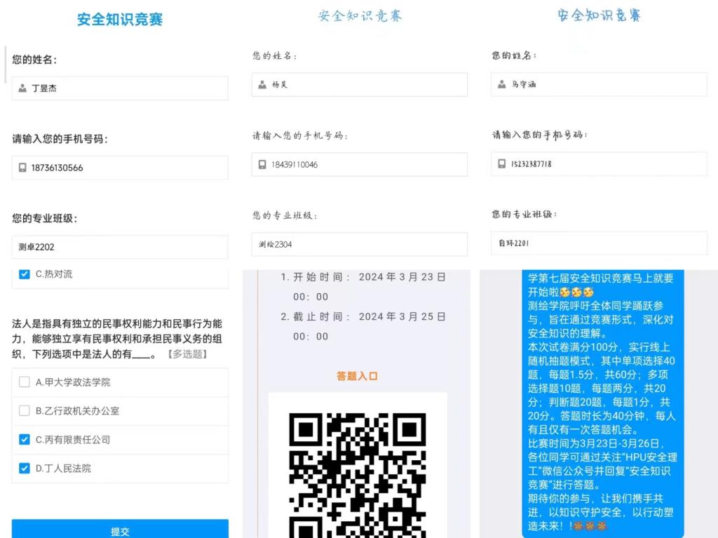 本次活动由校团委和保卫处主办,大学生安全协会、大学生消防协会、大学生反邪教协会、大学生交通协会共同协助。参赛者通过线上随机抽题模式进行竞赛,每人有且仅有一次答题机会,答题时长为40分钟。测绘学院以班级为单位做好宣传动员,充分发挥宣传委员班级职能,呼吁全体学生踊跃参与,以竞赛之笔,绘安全之卷。比赛设置一、二、三等奖,以奖促优,鼓励大家学习安全知识,防患于未然。