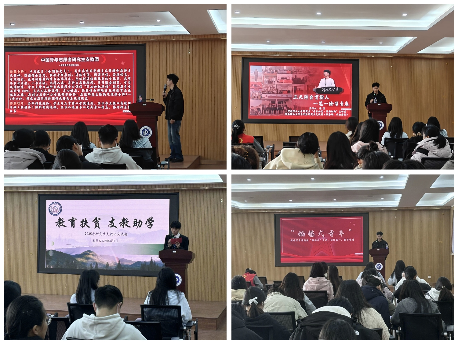 支教无悔青春路,育人有情岁月长。为了推进教育事业的发展,改善偏远地区教育现状,帮助有志于支教的大学生明晰方向,外国语学院邀请河南理工大学第四届研究生“青春向党•研海翱翔”宣讲团于3月9日下午15:00在文综楼302开展了“教育扶贫,支教助学”宣讲活动。外国语学院2022级、2023级学生代表和外国语学院青协全体成员认真聆听了宣讲。