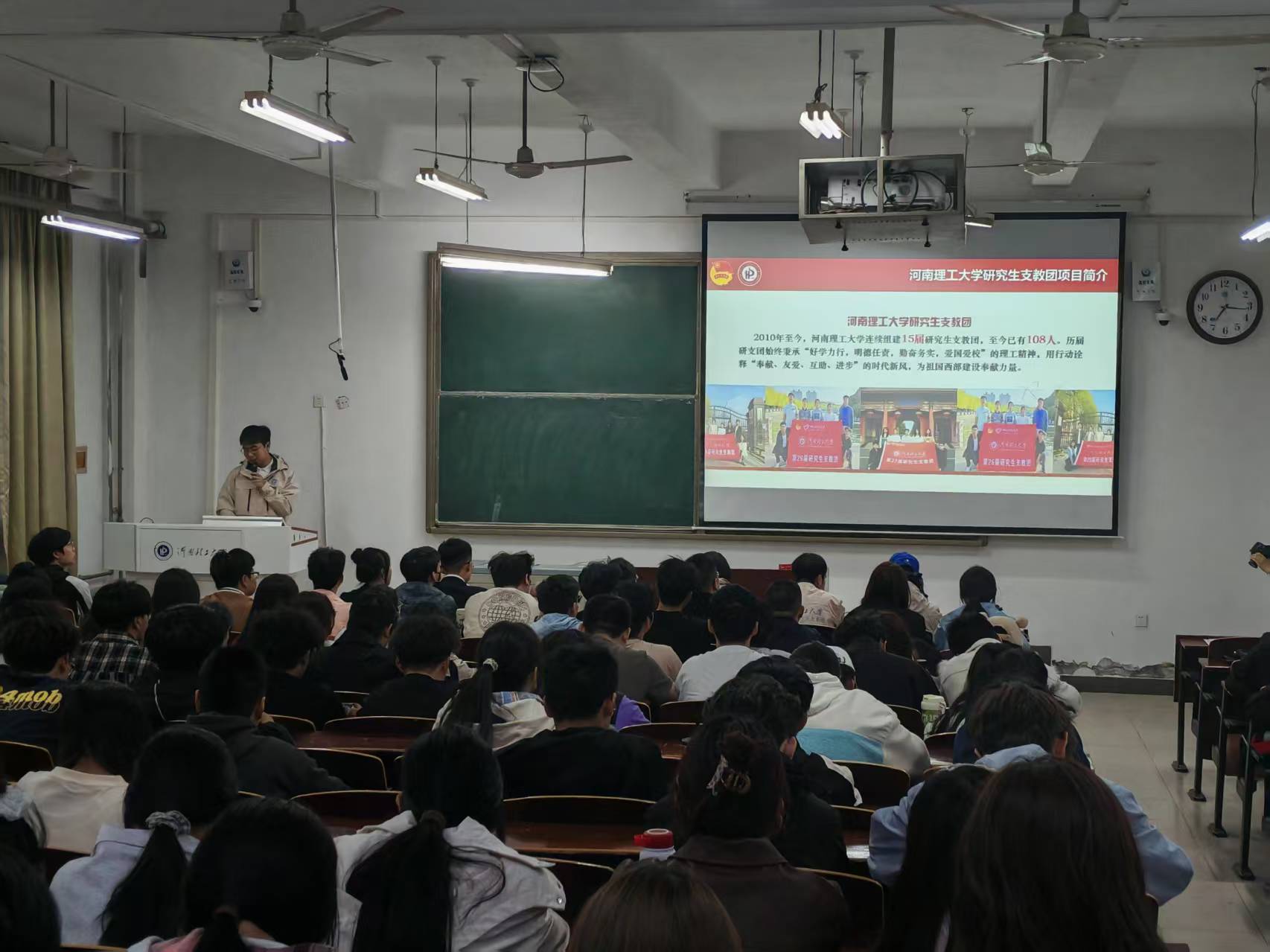 4月13日下午,计算机学院邀请学校“新时代·青年说”宣讲团成员刘博源以及第27届研究生支教团成员杨其麟在计算机学院103教室举办宣讲会,学院第十四期“青马班”成员及入团积极分子参加此次宣讲会。