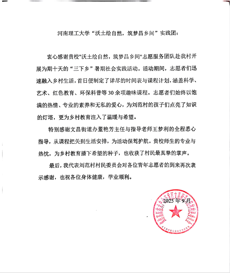 实践期间,团队成效显著获多方肯定。所在街道办为全体队员颁发“优秀实践个人”荣誉证书,表彰其在乡村振兴与教育发展中的贡献;刘范村村委会特致表扬信并赠送锦旗,点赞大学生的奉献精神与实践成果。 此外,团队事迹引起社会广泛关注,先后获得国家级媒体宣传报道18次、省级媒体36次,产生了良好的示范效应和社会反响。