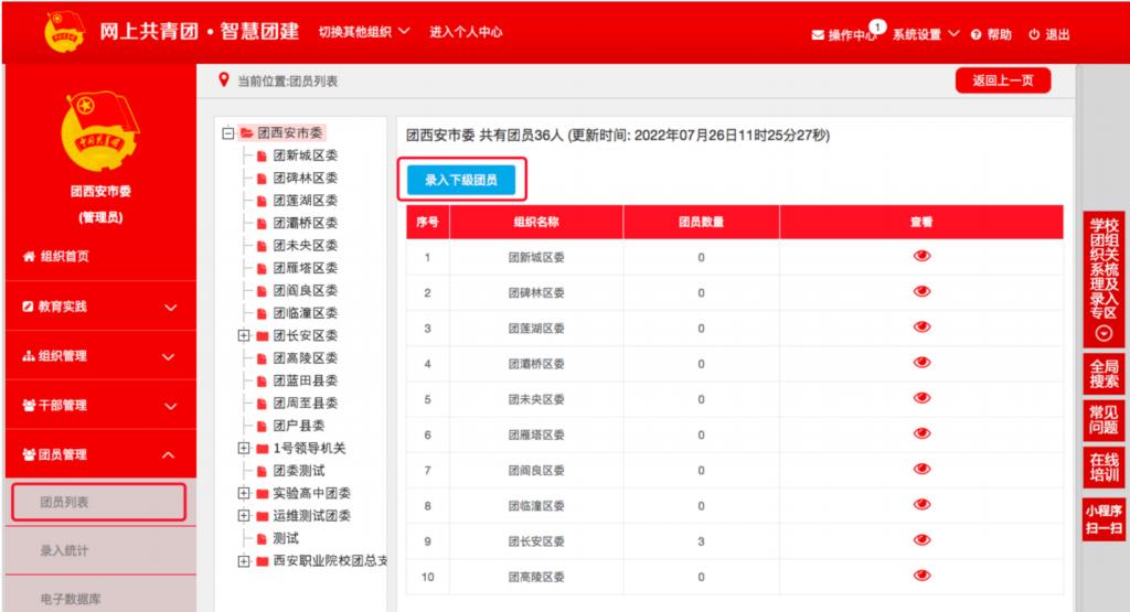 2. 审批。省级团委管理员点击“团员列表”,选择左上角“录 入下级团员”,进入“审批列表”界面。确认符合有关规定后,点击“审批”并选择“同意并核发编号”,系统将自动分配编号。