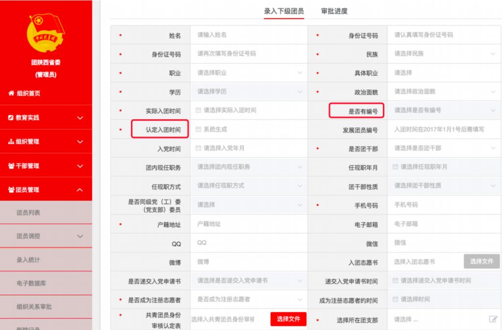 1. 申请。 由团的领导机关管理员点击“团员管理—团员列 表”模块,选择左上角“录入下级团员”,进入团员信息录入界 面。填写必填信息(“是否有编号”一栏选择“否”),点击“申 请核发编号”,发至省级团委审批。