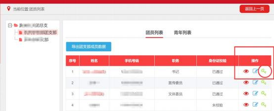 第二种组织管理员修改本组织内成员信息: 团员/干部管理-团员/干部列表-人员列表信息的操作栏点击编辑按钮;